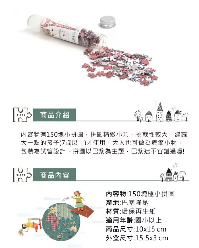 這是一款超迷你的拼圖,共150片以巴黎艾菲爾鐡塔為主題,挑戰性極高,較適合成人及小童一起合力完成,